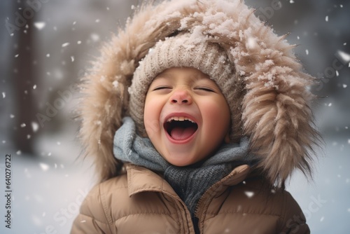 Cute child with happy face wearing a warm hat and warm jacket surrounded with snowflakes. Winter holidays concept.