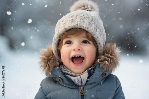 Cute child with happy face wearing a warm hat and warm jacket surrounded with snowflakes. Winter holidays concept.