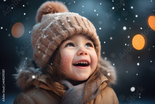 Cute child with happy face wearing a warm hat and warm jacket surrounded with snowflakes. Winter holidays concept.