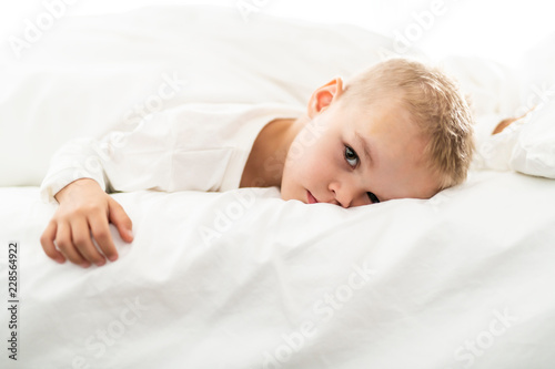 cute four years boy in white bedding