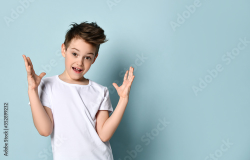 Cute funny boy in white shirt surprised, amazed or delighted with something, raising hands up. Half-length portrait isolated on light blue