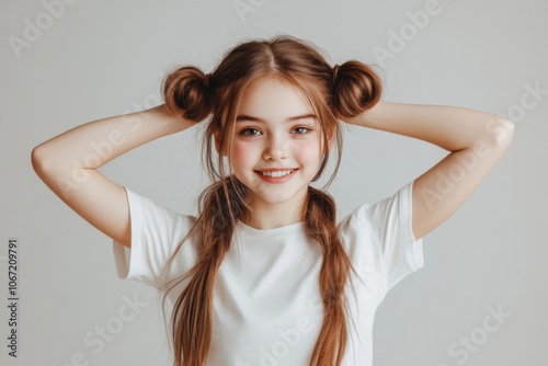 Cute Girl Smiling with Pigtails, Wearing White Short Sleeves, Posed on Light Gray Background