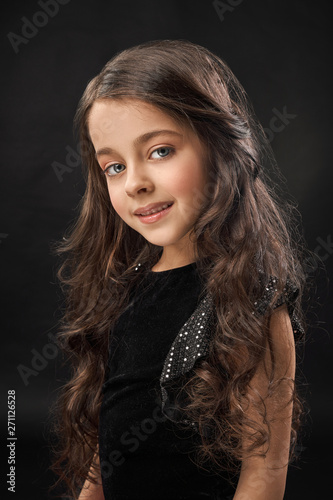 Cute girl with curly hair looking at camera and smiling.