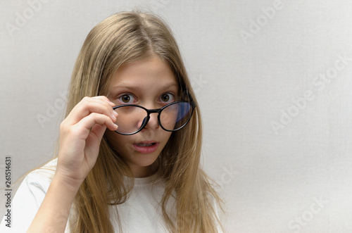 Cute girl with glasses look with a suspicious look. Doubt, mistrust, surprise