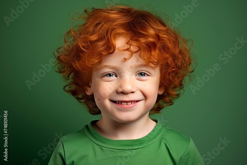 Cute handsome little todler boy with curly red hair and freckles wearing an green T-shirt on an plain green background. Place for text. Studio portrait of happy red-haired child