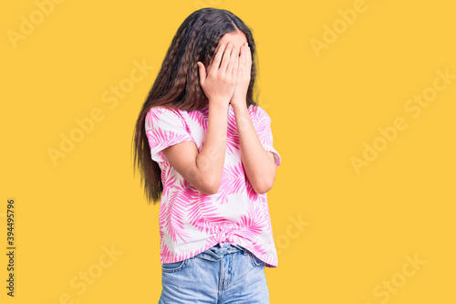Cute hispanic child girl wearing casual clothes with sad expression covering face with hands while crying. depression concept.