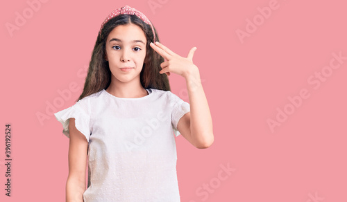 Cute hispanic child girl wearing casual white tshirt shooting and killing oneself pointing hand and fingers to head like gun, suicide gesture.
