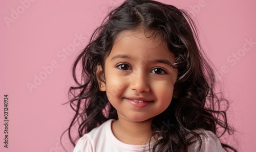 Cute indian little girl standing on pink background
