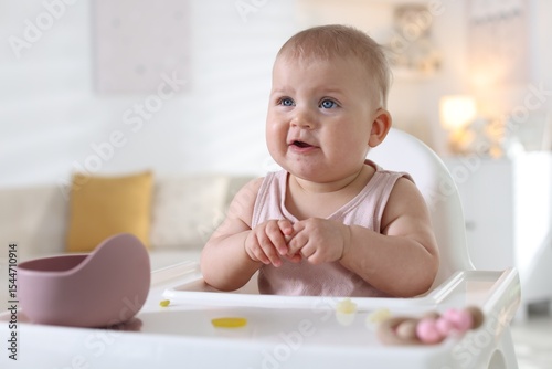 Cute little baby eating on feeding chair at home