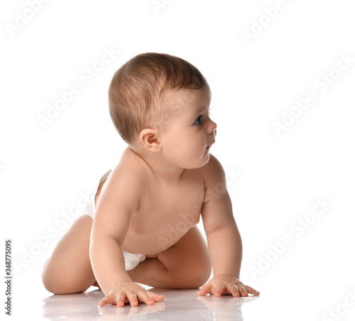 Cute little baby girl infant naked in diaper try to creep on floor looking at the corner isolated on white background