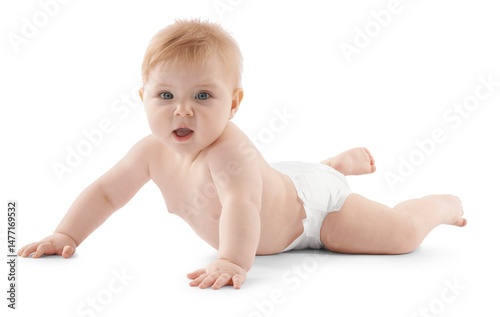 Cute little baby in diaper on white background