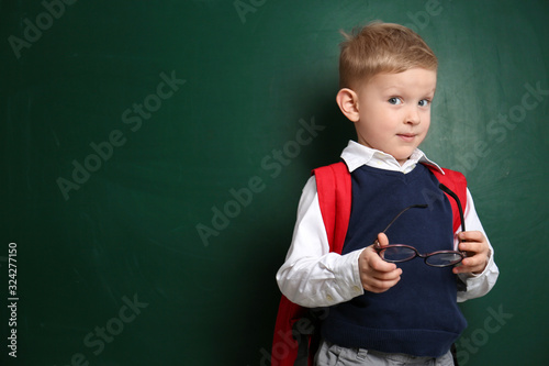 Cute little child near chalkboard, space for text. First time at school