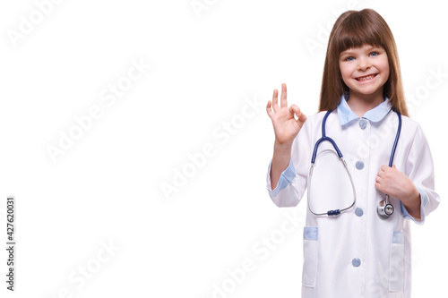 Cute little girl doctor wearing white coat holds stethoscope and shows OK gesture on white isolated background