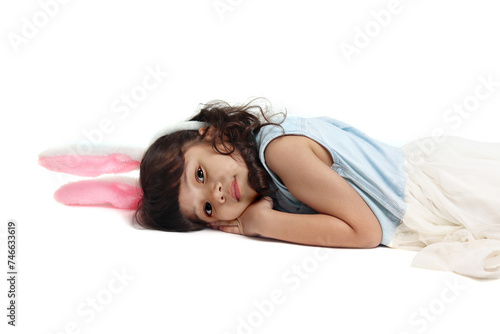Cute little girl wearing pink bunny ears lying down on floor. Joyful kid celebrating Easter day on white background. Happy child on Easter holiday celebration.