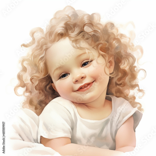 cute little girl with light curly hair smiles coquettishly,on a white background,