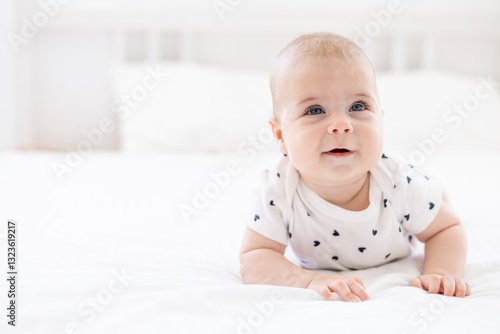 cute little newborn baby with blue eyes on a white bed, baby woke up in the morning or falling asleep, happy baby at home on a cotton bed smiling