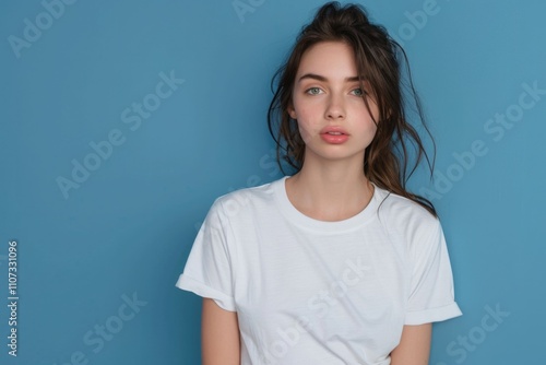 Cute Mockup. Portrait of a Beautiful Woman Wearing White T-Shirt for Mockup on Blue Background