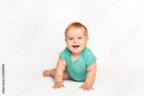 Cute small caucasian toddler baby boy child crawl on white studio floor. Smiling little infant kid wearing a green t-shirt explore world. Childcare and upbringing concept.
