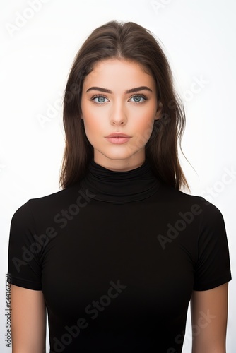 Cute student girl wearing black turtleneck sweater with blue grey eyes isolated on white background