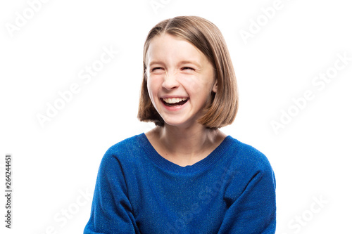 Cute teen girl laughs, closing her eyes. Close-up. Isolated on a white background