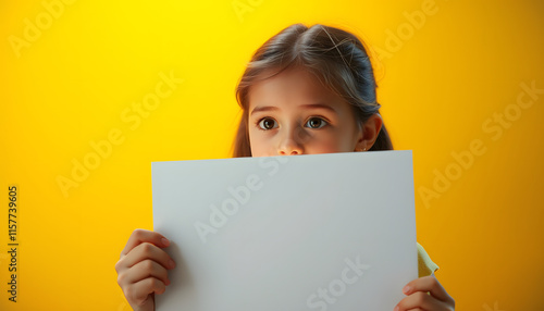 Cute teenage girl looking out of white blank placard for your text or product, yellow background, mindfulness theme. isolated with white highlights
