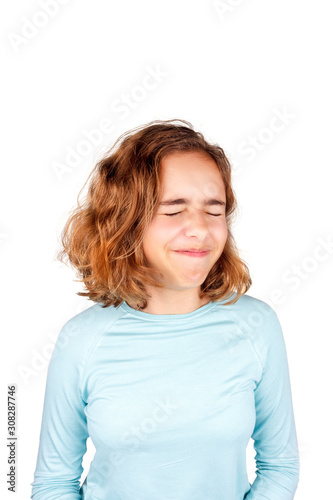 Cute teenager girl with funny face expression looking to camera, isolated. April fool day