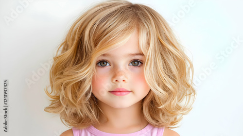 Cute toddler girl, blonde curly hair, portrait, white background, family website