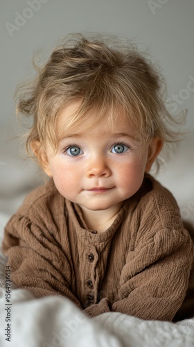 Cute toddler with big blue eyes and tousled hair poses on soft fabric in a cozy, neutral-toned setting during daytime