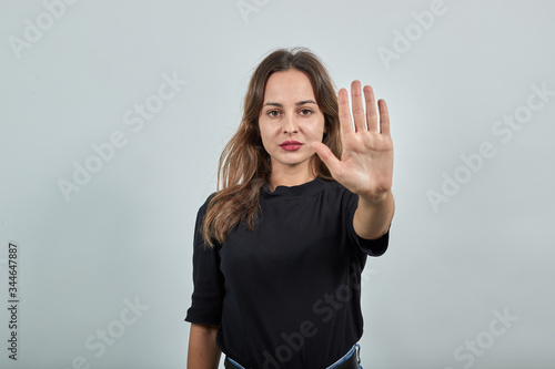 Cute Young Brunette Woman In Black T-Shirt, Blue Jeans With Belt On Gray Background, Dissenting Girl Against, Shows Protest, Opposition, Gesturing With Her Hand, Shows Palms As A Stop Sign