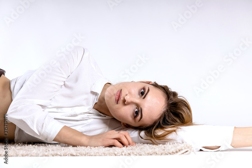 cute young girl lies on her side on the floor on a white background