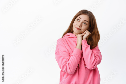 Cute young woman looks dreamy aside, gazing at logo at upper left corner, daydreaming or thinking, imaging something romantic and beautiful, white background