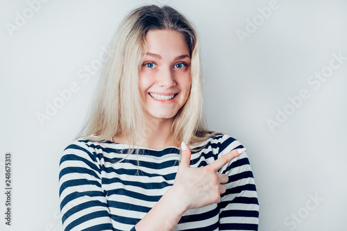 Cute young woman points a finger away. Presenting your product. Expressive facial expressions