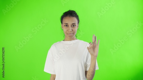 CuteAfro-American Girl is showing ok with two thumbs and smiling on chroma key Background in Studio