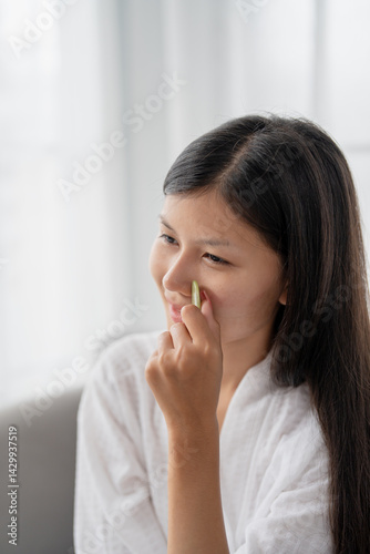 Daily beauty routine Asian woman self care doing gua sha facial massage Traditional medicine Gua Sha quartz stone Cosmetic natural trend.