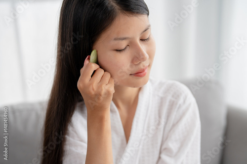 Daily beauty routine Asian woman self care doing gua sha facial massage Traditional medicine Gua Sha quartz stone Cosmetic natural trend.