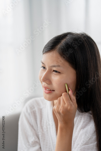 Daily beauty routine Asian woman self care doing gua sha facial massage Traditional medicine Gua Sha quartz stone Cosmetic natural trend.