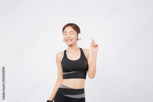 Dance takes over as she enjoys the moment with headphones on. Later, her body moves again to a fresh beat, embracing the dance as part of her daily joy. isolated studio white background