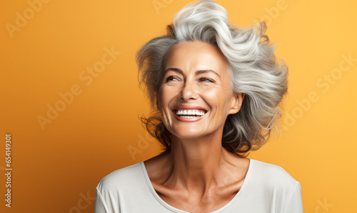 Dazzling Smile: Portrait of Elderly Woman on yellow background with Healthy Skin and Teeth
