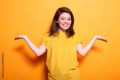 Delighted, thrilled woman with extended arms, brown hair, and a big smile stands against isolated orange background. She exudes happiness and contentment and radiates positive emotions.