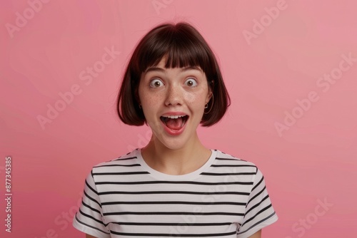 Dental Funny. Lovely Girl in Striped Shirt at Dentistry Clinic Ad on Pink Background