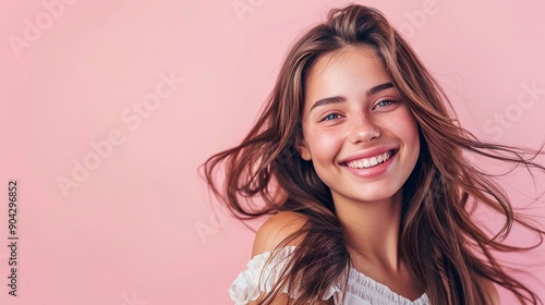 Depict a young woman with long hair, posed against a soft pink background, smiling brightly with a joyful and carefree attituder