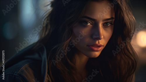 Depressed young woman near window at home, closeup, Generative AI