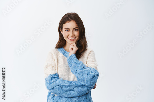 Determined woman in sweater looking thoughtful and pleased at camera, smiling with pensive face, standing against white background