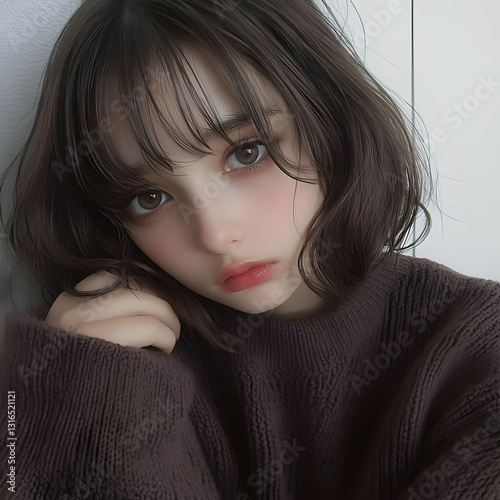 Digital Painting of a Young Woman with Brown Hair and Sweater, Pensive Expression, Close-up Portrait, Soft Lighting, Realistic Style