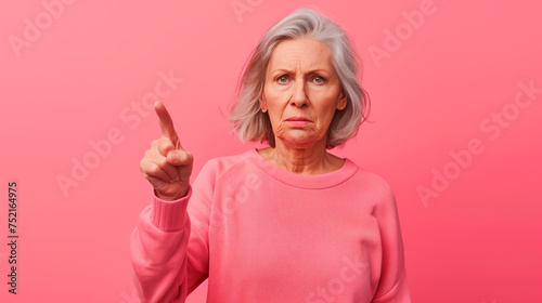 Disapproving senior woman wagging finger, pink background.