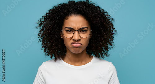 Disgusted Young Black Woman with Curly Hair and Glasses Against Blue Background