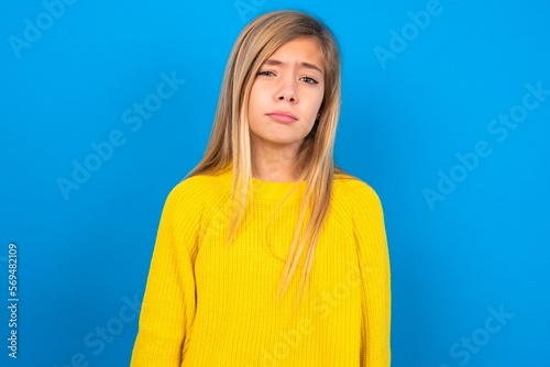 Displeased caucasian teen girl wearing yellow sweater over blue studio background frowns face feels unhappy has some problems. Negative emotions and feelings concept