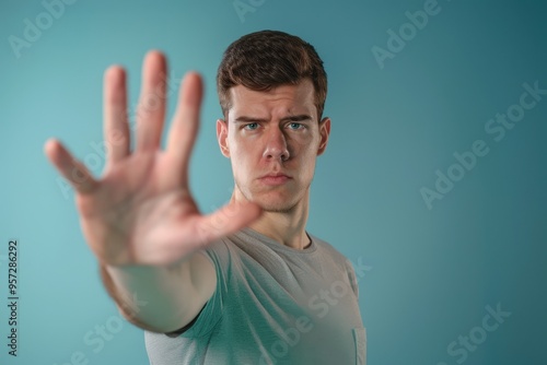 Displeased Man Posing, Showing Stop Gesture with Look of Dislike