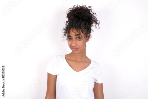 Displeased Young beautiful girl with afro hairstyle wearing white t-shirt over white background frowns face feels unhappy has some problems. Negative emotions and feelings concept