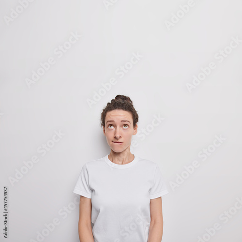 Displeased young millennial woman bites lips focused above listens something with attentive gaze upwards poses against white background copy space for your advertising content. Clueless female model